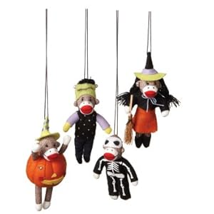 Reviews for Set of 4 - Halloween Sock Monkey Ornaments that includes Pumpkin, Skeleton, Witch and Frankenstein Monster Costume Cute little sock monkeys dressed for Halloween. Just fun and artful. I am going to separate them up and put one in every grand-child's trick or deal with goodie bag.