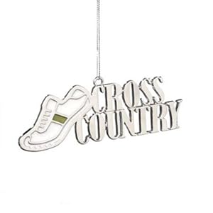 This ornament is made from metallic and says: CROSS COUNTRY. Attached to the text is a operating shoe. The ornament measures simply over three inches in size and includes a placing loop for simple placing.