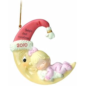 - Precious Moments Porcelain Bisque Baby's first girl ornament napping so peacefully on 1 of 4 moon sporting a Santa's hat bearing the the year 2010