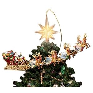 First-Ever Thomas Kinkade Animated Santa Claus Treetopper Collectible! Lights Up and Rotates Around Your Christmas Tree! - Santa is heading to your city in a sleigh filled with presents, pulled by darling reindeer. Now that you might capture this picture with a Thomas Kinkade Christmas tree decoration. This first-of-a-kind animated Santa Claus treetopper circles around your tree on a golden spring, and features a incredible illuminated star. Available completely from The Bradford Editions, this 3-dimensional Thomas Kinkade Christmas decor is perfectly handcrafted. Each reindeer's saddle blanket shows a distinct Thomas Kinkade holiday classic in full colour, seen on either side. Festive bows, garlands, and golden runners accent the sleigh. A great collectible Christmas treetopper reward or the animated Christmas decor you've been looking for. Big demand is predicted.