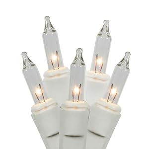 Features: Color: clear bulbs / white wire Number of bulbs on string: 100 Bulb size: mini Spacing between each light: four inches Lighted string length: 33 ft (10m) Total string length: 34 feet (10.36m) Wire gauge: 22